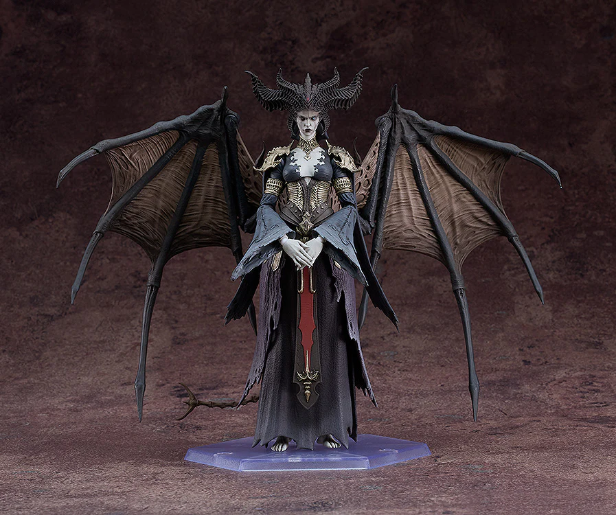 Figura articulada da linha figma inspirada em Lilith, a icônica antagonista de Diablo IV. A peça recria com fidelidade o visual sombrio da personagem, incluindo seus grandes chifres curvados, asas abertas com textura detalhada e traje com acabamento orgânico e ornamentado.