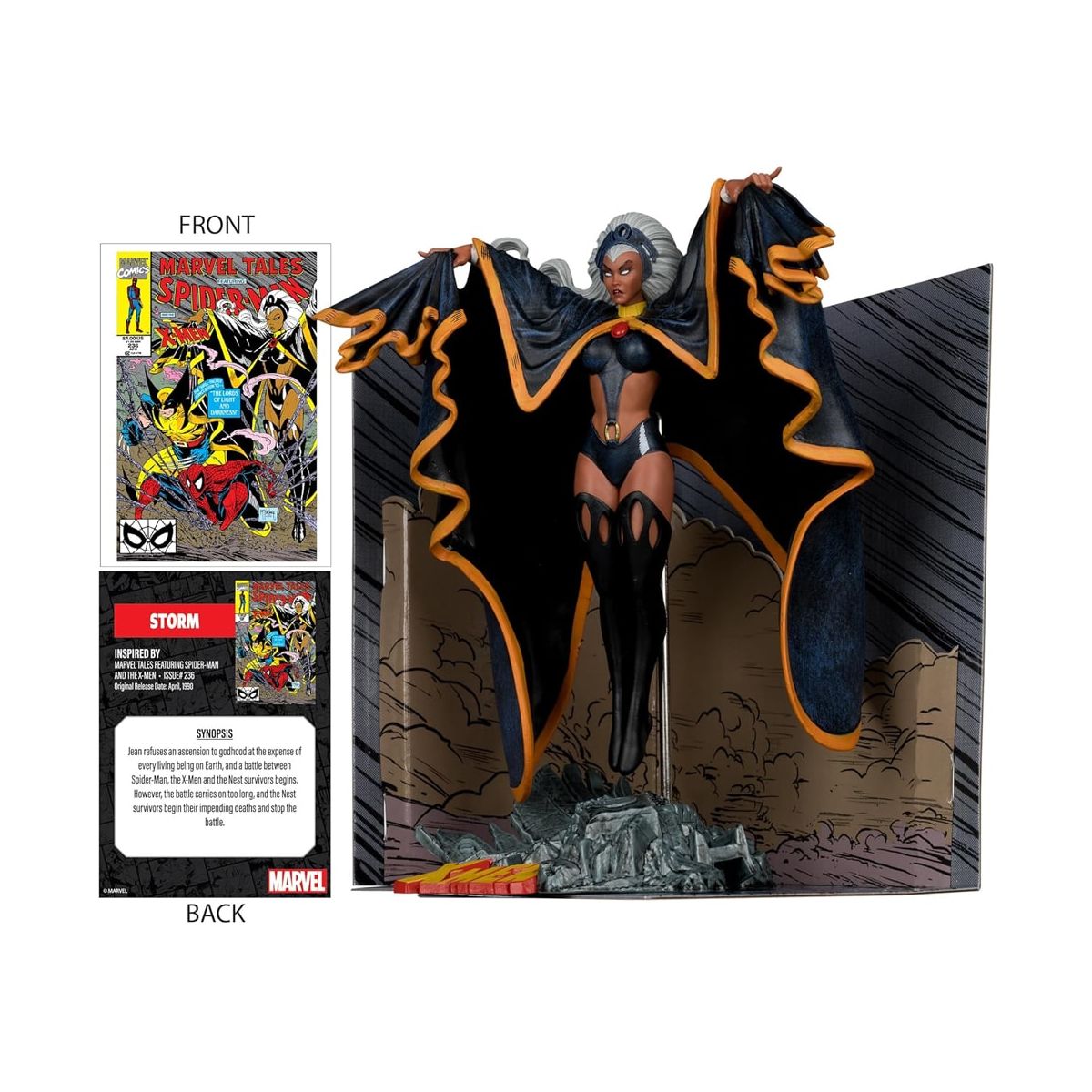 A peça retrata Storm em pose imponente, com sua capa dramática aberta e visual icônico dos anos 80/90, recriando fielmente o estilo dinâmico das capas da época. O cenário inclui base temática e backdrop no formato de capa de HQ.