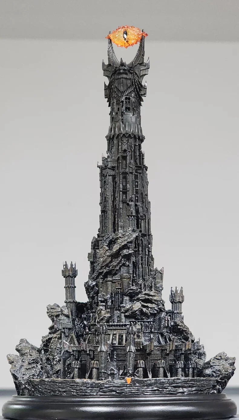 Estátua ambiental em polystone produzida pela Weta Workshop representando a imponente Torre de Barad-dûr, fortaleza de Sauron na Terra-média.